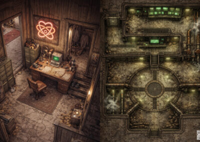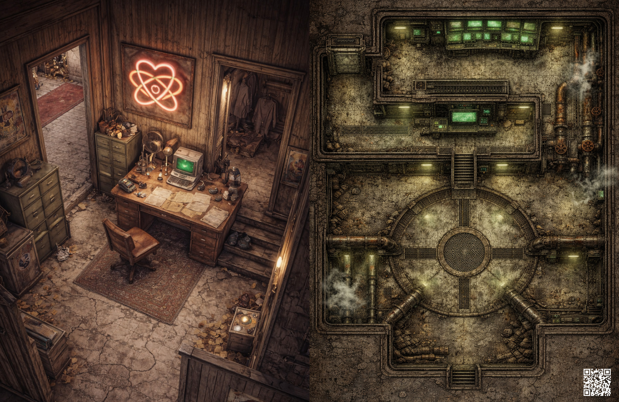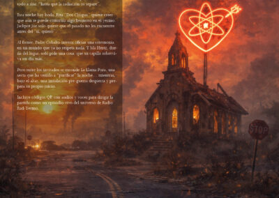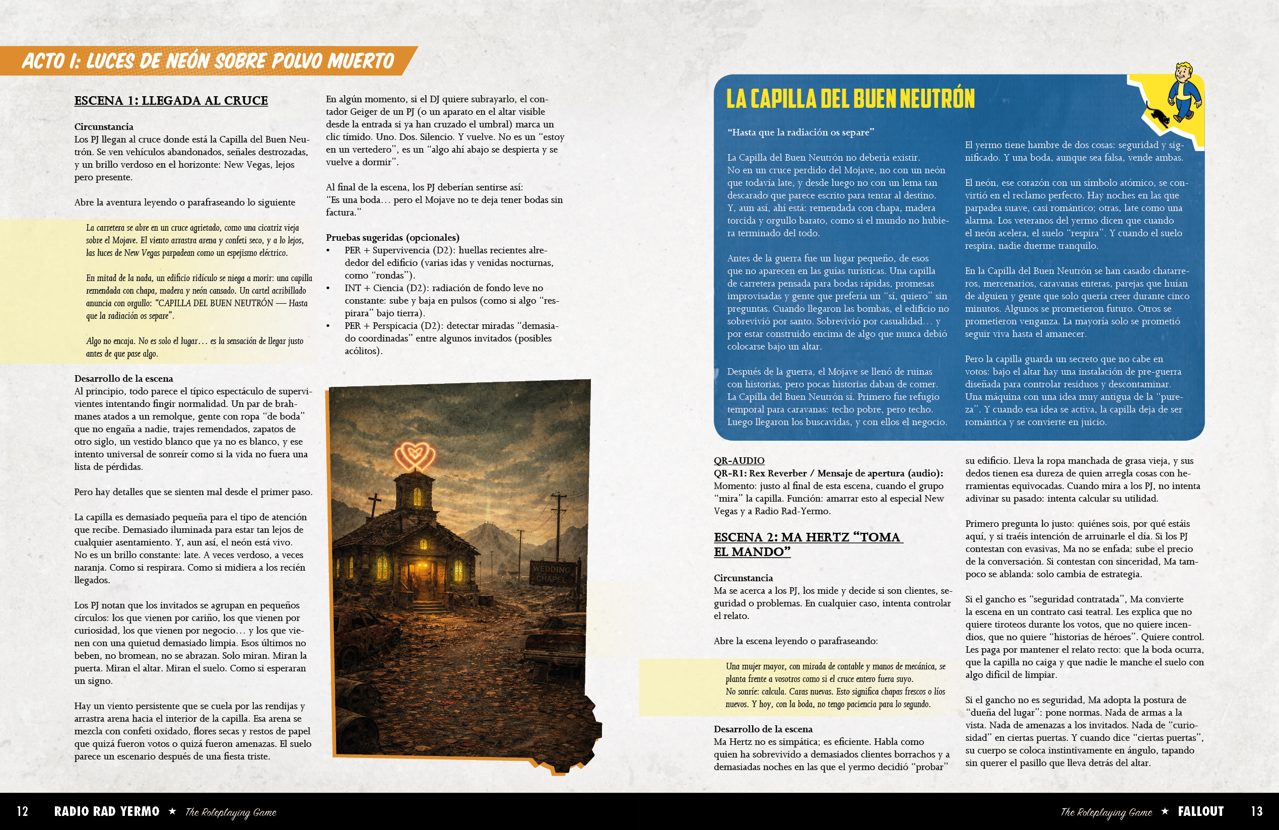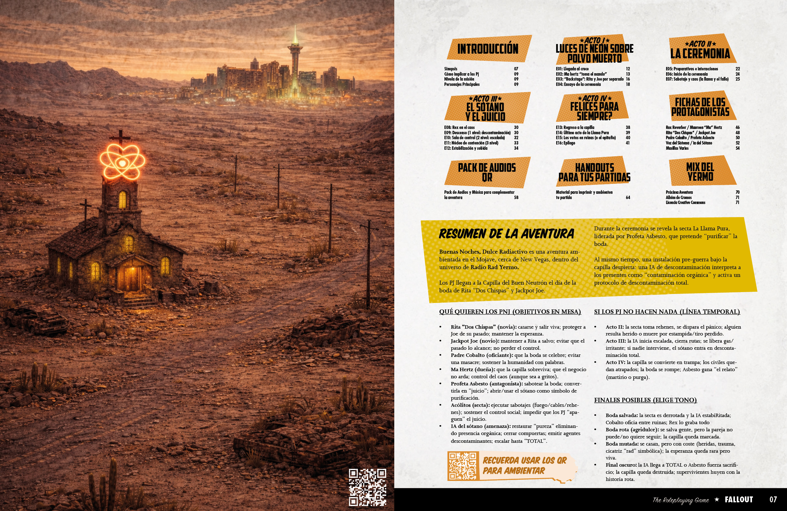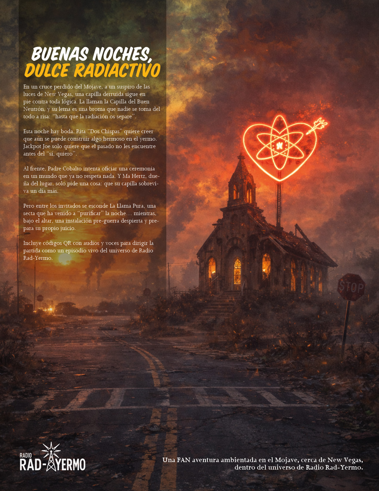 En una capilla de carretera donde todavía se celebran bodas “hasta que la radiación os separe”, una ceremonia aparentemente absurda está a punto de convertirse en una noche inolvidable. Bajo las luces de neón del Buen Neutrón, los personajes jugadores se verán atrapados entre novios del yermo, fanáticos incendiarios, secretos enterrados y un subsuelo que nunca debió volver a abrirse.