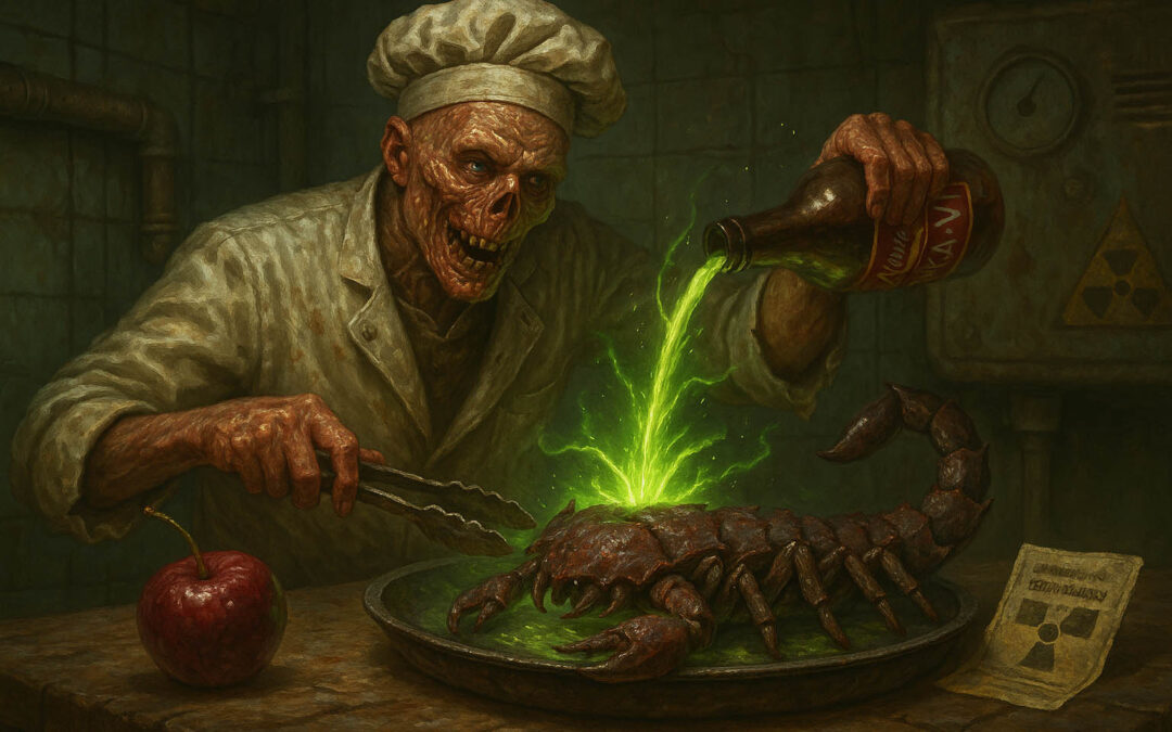 Para los que no lo saben, la carne de mutascorpión no solo es un bocado raro, sino que puede proporcionar una fuente valiosa de proteínas, siempre y cuando uno tenga el estómago (¡y quizás el sistema inmune!) para aventurarse a probarlas. La receta secreta del Chef Necrótico comienza con un paso inusual pero lleno de sabor: dejar que la carne repose de manera segura durante una tormenta radiactiva suave. Este proceso garantiza que la carne absorba esas maravillosas esencias minerales del Yermo, dándole ese toque atrevido que solo un buen fan de Fallout sabría apreciar.Después de la tormenta calmada, el siguiente ingrediente estrella es la cereza oscura, una fruta que, como dicen los rumores, puede encontrarse en ciertos lugares favorecidos poco conocidos, y que al ser mezclada con la carne de mutascorpión, proporciona un contraste dulce y exquisito que realza aún más los sabores radiactivos. Entonces, amigos del Yermo, la clave aquí es el equilibrio: oscuridad y dulzura en un solo bocado.Finalmente, el toque maestro del Chef Necrótico, que separa esta atrevida receta de todo lo demás, es la chispa gamma. Este último destello de sabor no solo provoca una explosión para el paladar, sino que conforma el final perfecto para este platillo que es peligroso, delicioso y, digámoslo, posiblemente ilegal. Nos dirigimos a la oficina local de seguridad del Yermo para tratar de averiguar más sobre las implicaciones legales de preparar tal receta, pero en tanto lo hacemos, recordar siempre cocinar con precaución y estilo.