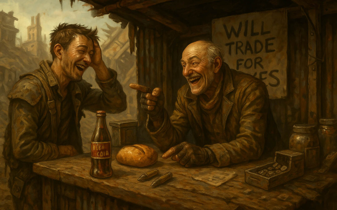 Así que, cuando te enfrentes a los peligros del Yermo, recuerda: a veces, lo más inesperado puede resultar ser tu mejor arma. ¿Y quién sabe? Tal vez el próximo gran comercio del siglo XXI no sea con chapas, sino con chistes.